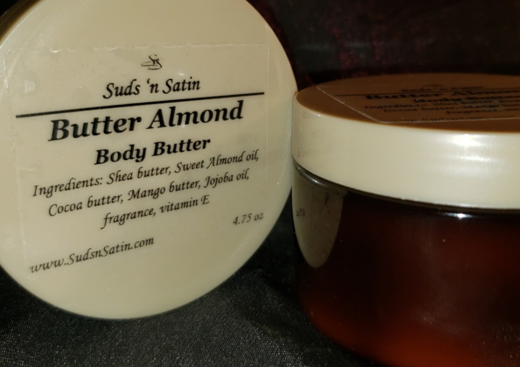 Made with shea, cocoa & mango butters & sweet almond oil. Leaves your skin soft but not greasy. Great for those really dry areas such as knees and elbows. Buttery Almond Rum Cake scent.